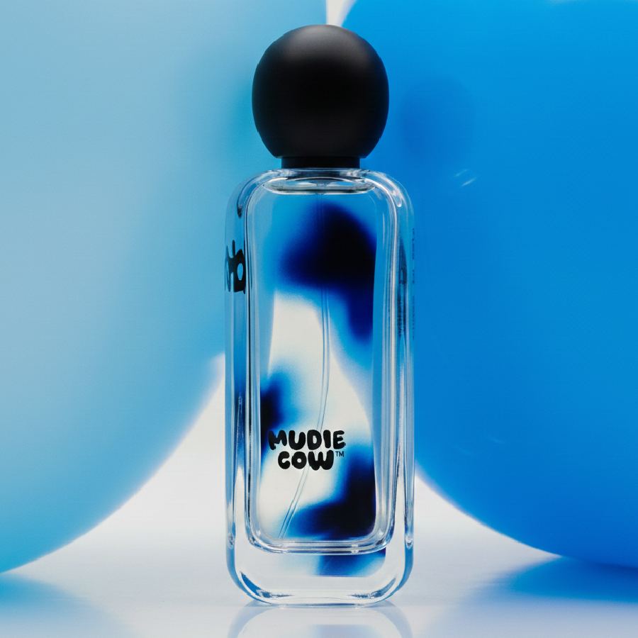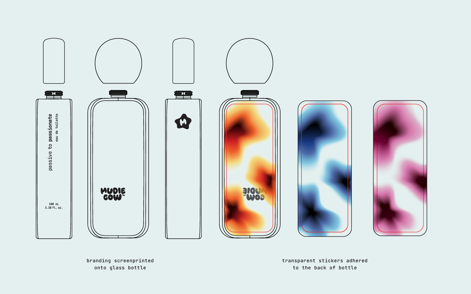 Mudie Cow is a cheeky play on the 'meh' feelings we all experience. Formulated for Gen Zennials, each scent embodies a distinct vibe: deep blues for calm, fiery oranges for passion, and bubbly pinks for flirty. Inspired by Y2K memorabilia like mood rings and lava lamps, colors transition from black to full saturation, reflecting the shift each fragrance promises. Founder Gillian Wall and I worked together over 10-ish months to bring this to life across full-size, travel, and sample bottles and boxes.